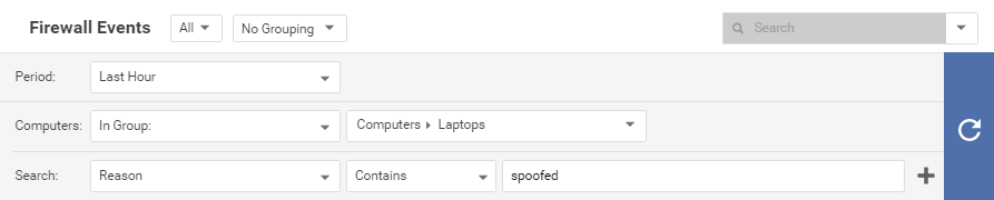 - Events: Go to one of the Events pages and use the Advanced Search options to filter the event data. For example, you could search for all firewall events for computers in the Computers > Laptops computer group that were logged within the last hour whose reason column contains the word spoofed.
